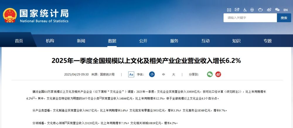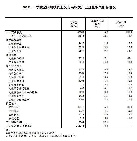 据对全国8.0万家规模以上文化及相关产业企业(以下简称“文化企业”)调查,2025年一季度,文化企业实现营业收入33939亿元,按可比口径计算(详见附注2),比上年同期增长6.2%[1]。其中,文化新业态特征较为明显的16个行业小类[2]实现营业收入14846亿元聚富人,比上年同期增长12.5%,快于全部规模以上文化企业6.3个百分点。