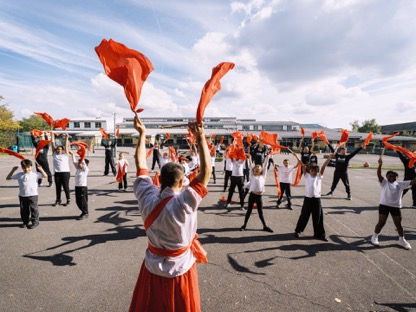 一条红丝带串联课堂,连接安塞腰鼓、中国式摔跤等活动,组成极具参与感与节奏感的课堂。