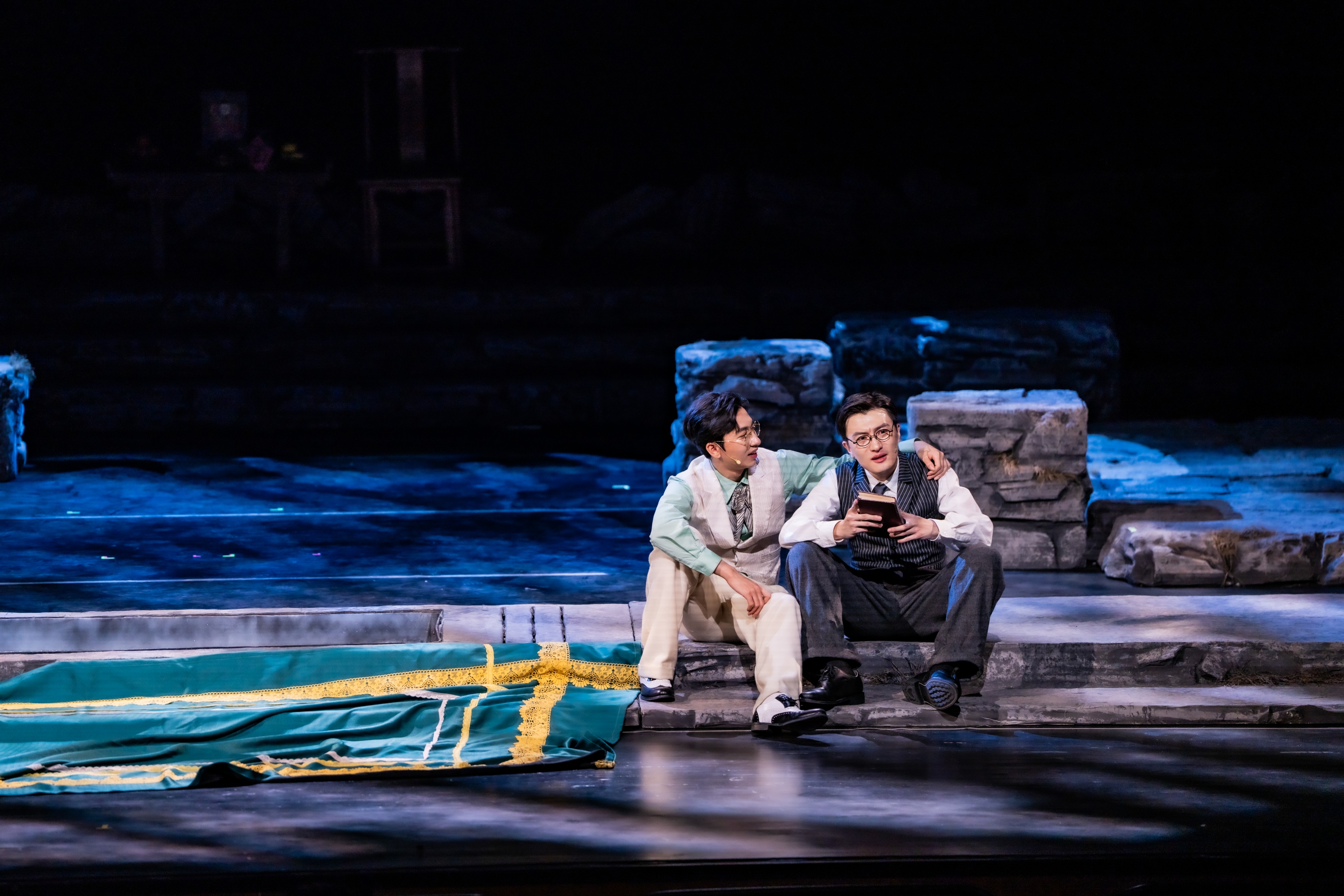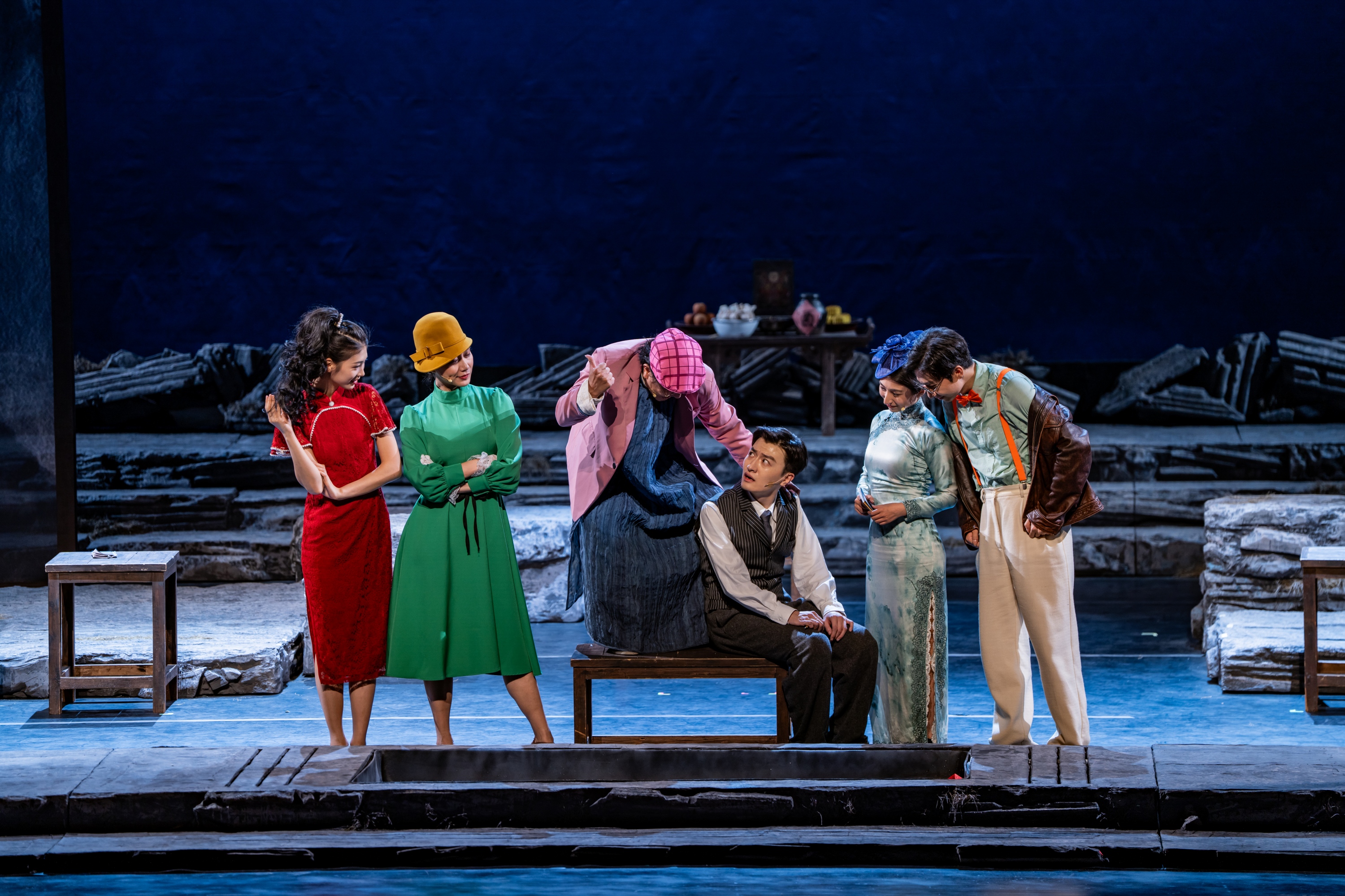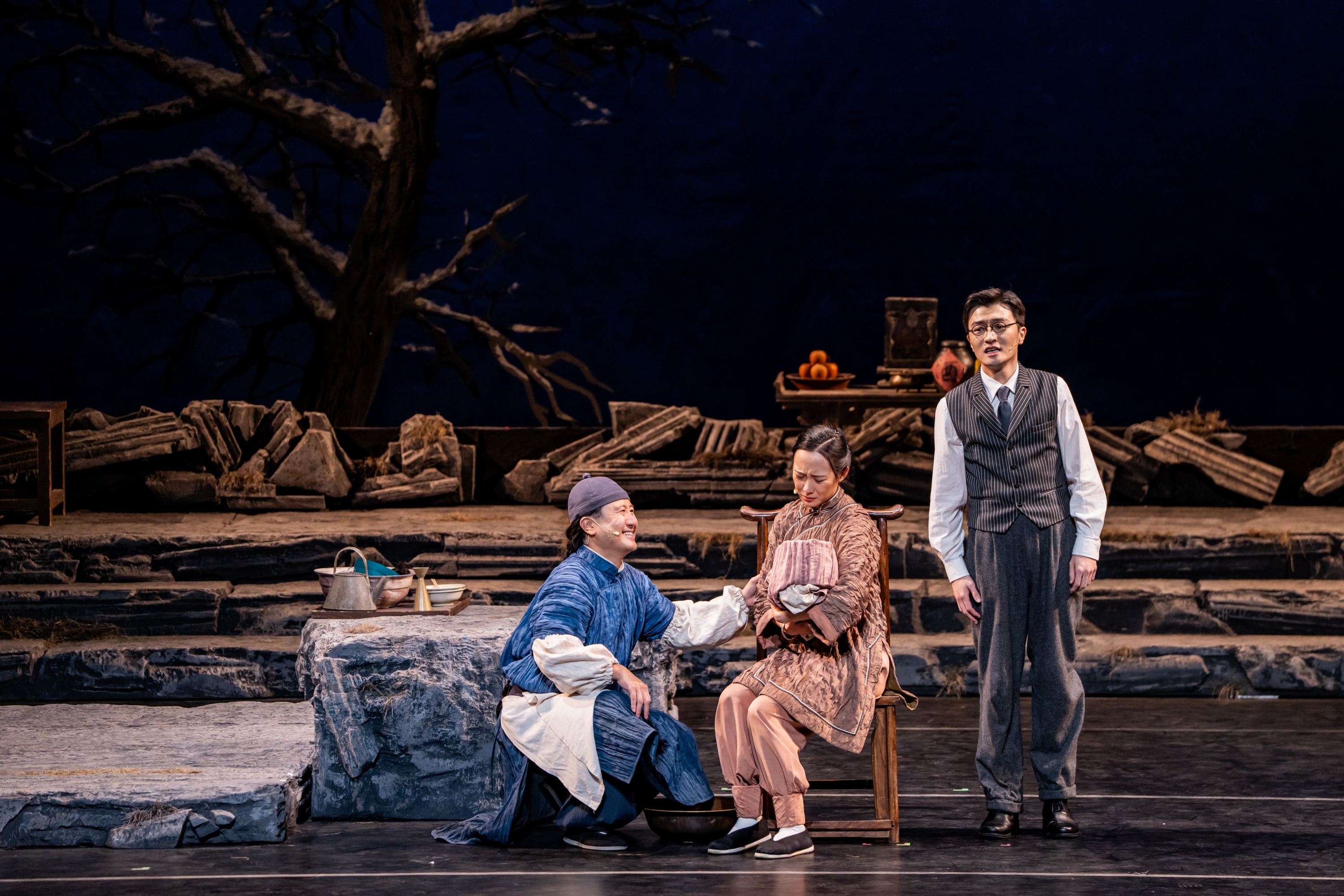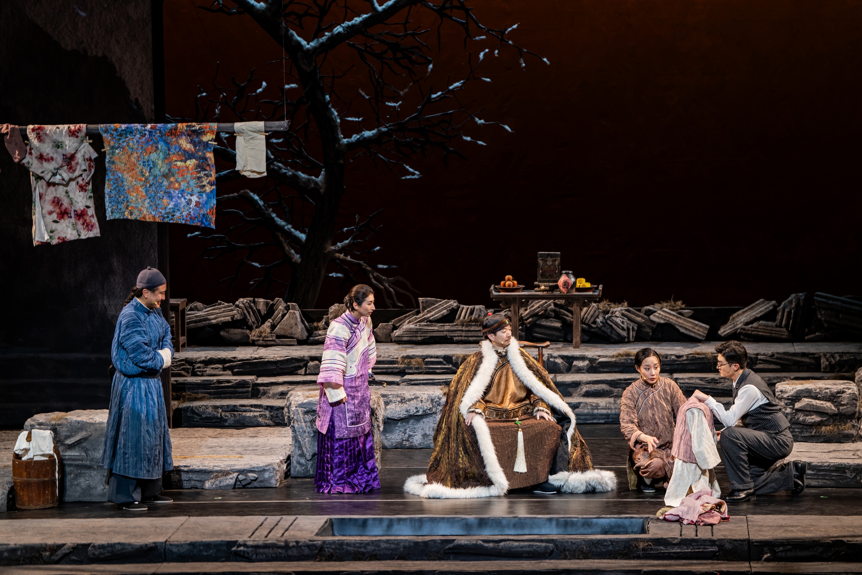 除此之外,舞台地面也由过去的雪地变成了石板地。石板形象参考了“圆明园”的石头形制,隐喻着“石头很顽强,虽然被摧残过,但是它依然在,并且会一直存在下去”。台前几盆老舍先生最爱的菊花,也依旧开得繁盛。